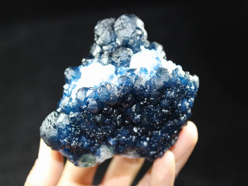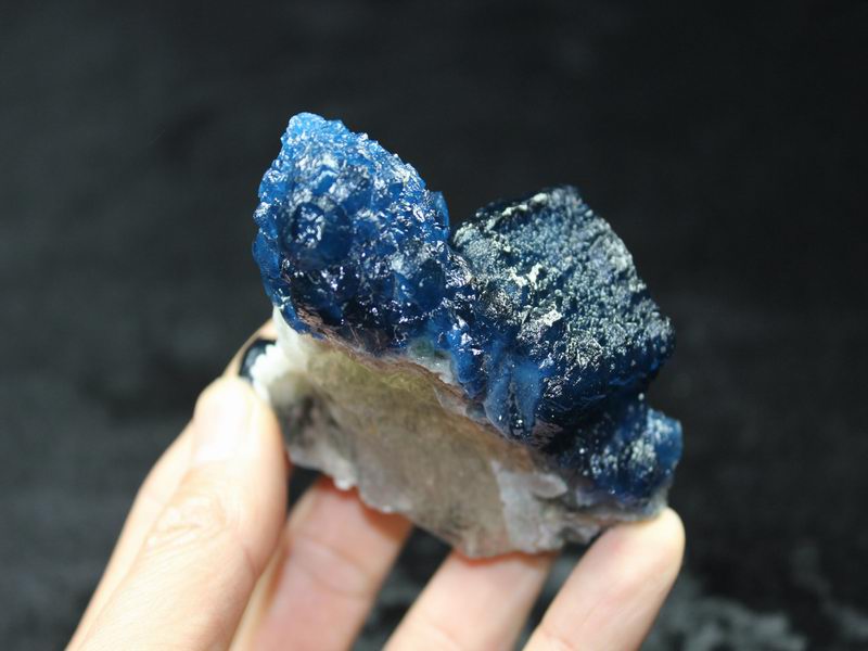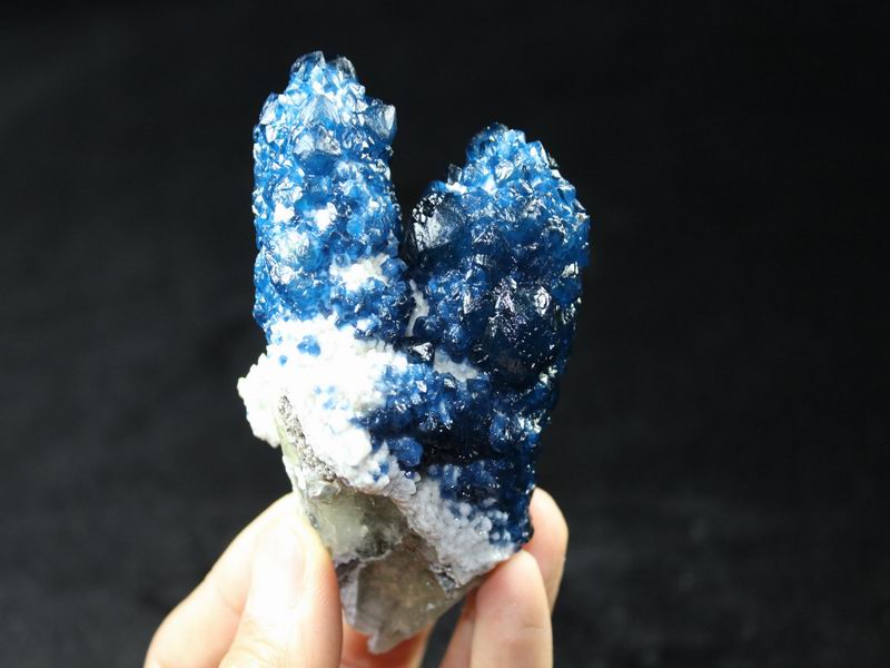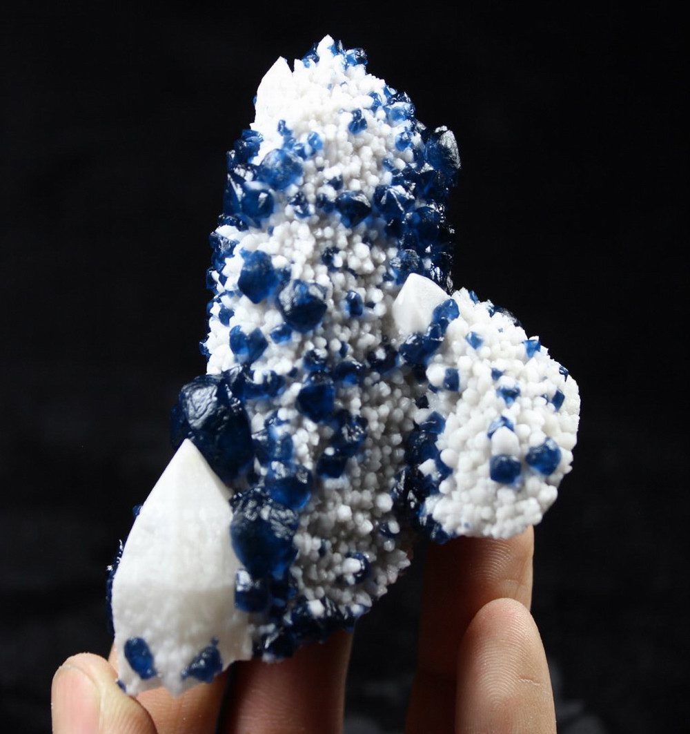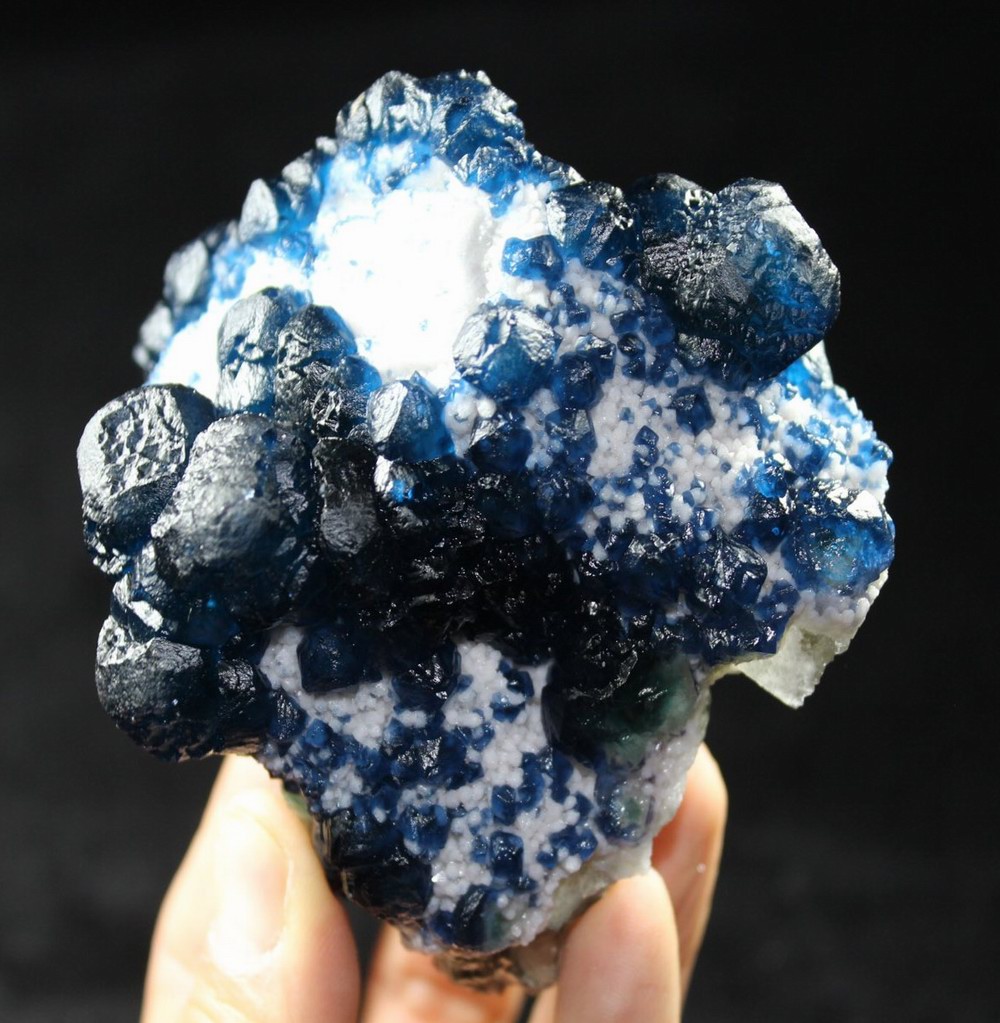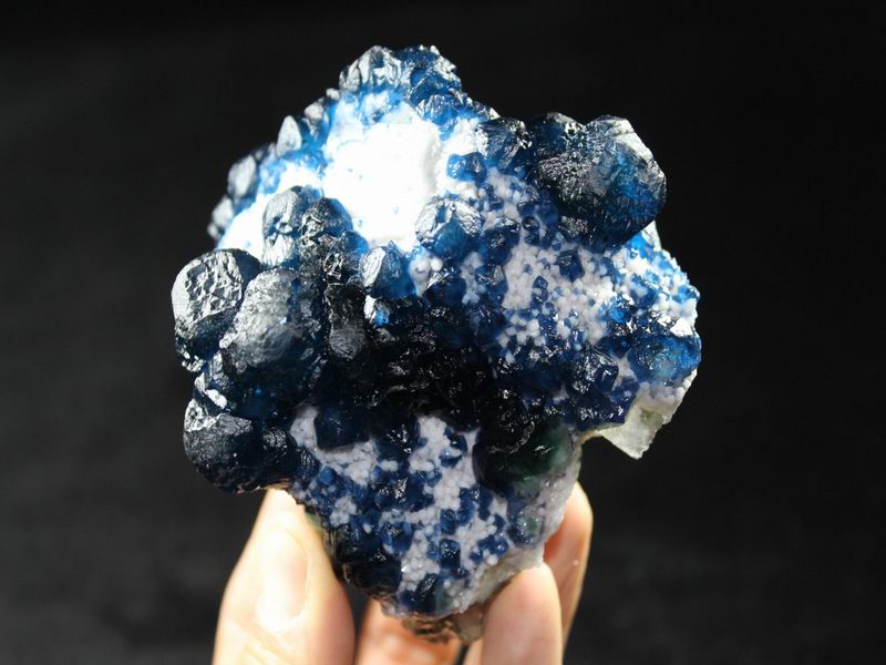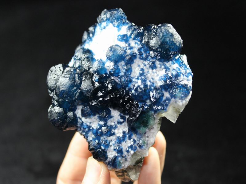 Vivid deep blue Fluorite crystals, with shades that vary between indigo and navy blue on a matrix of white crystallized Quartz. The smaller Fluorite crystals are neatly cubic, with small dodecahedron bevels and with very well defined curvatures on faces and edges, while the largest ones are unusually strongly rounded, a very uncommon shape for Fluorite. This shape is due to the balanced forms of the cube, polycrystalline and deeply edged, and the smooth dodecahedral faces, both dodecahedron and cube have curved faces and edges. Completely different from other, previous finds in Huanggang, it is a kind of dream for lovers of unusual crystallography.
