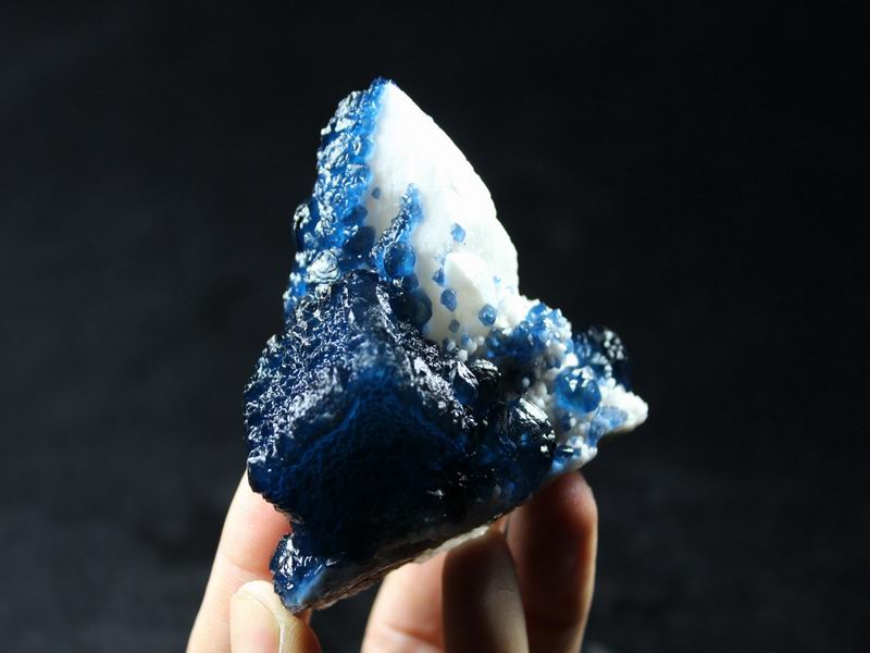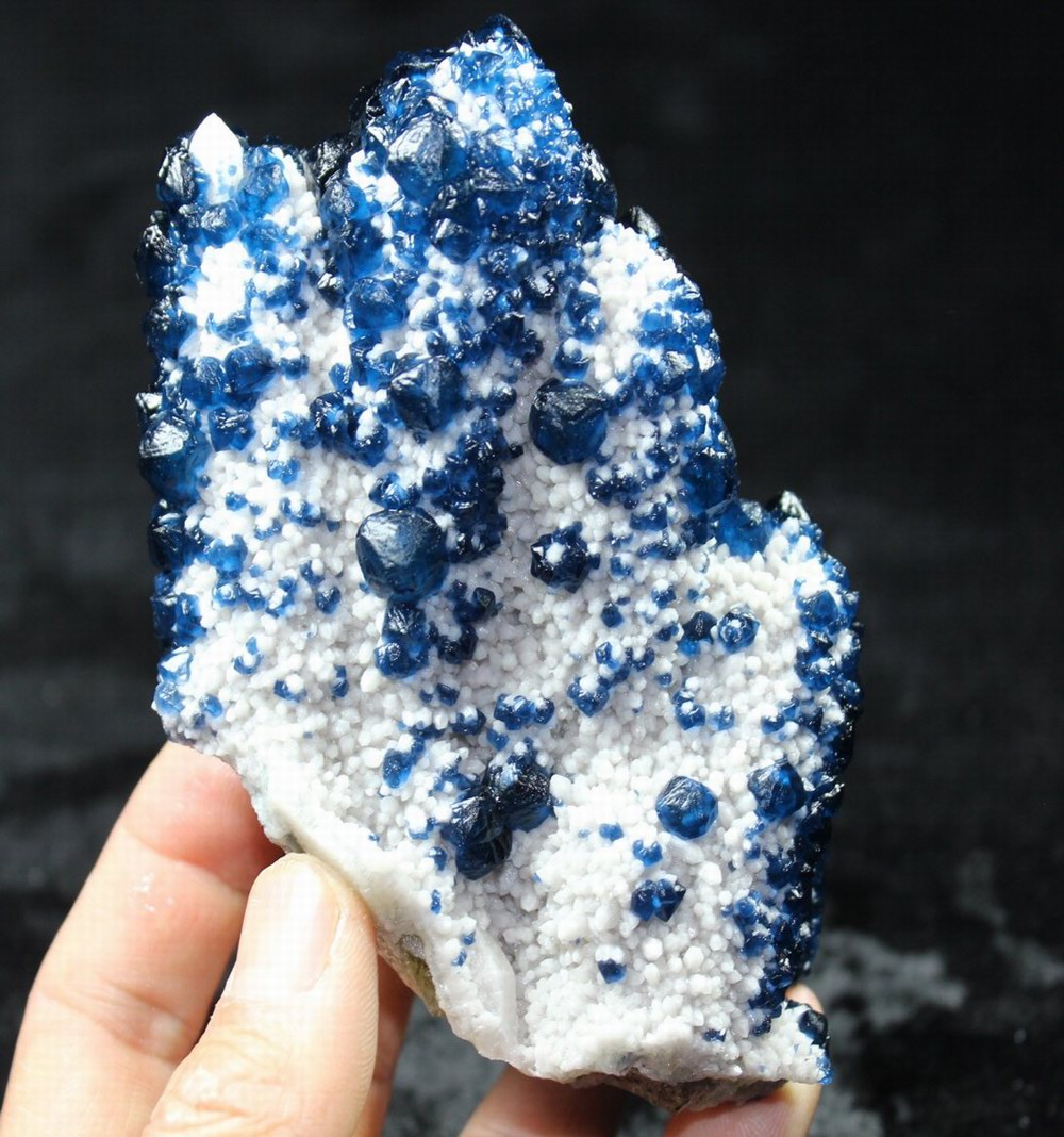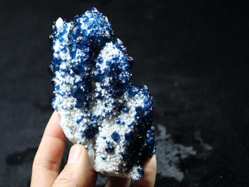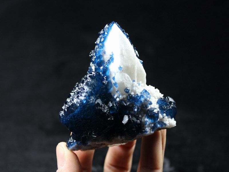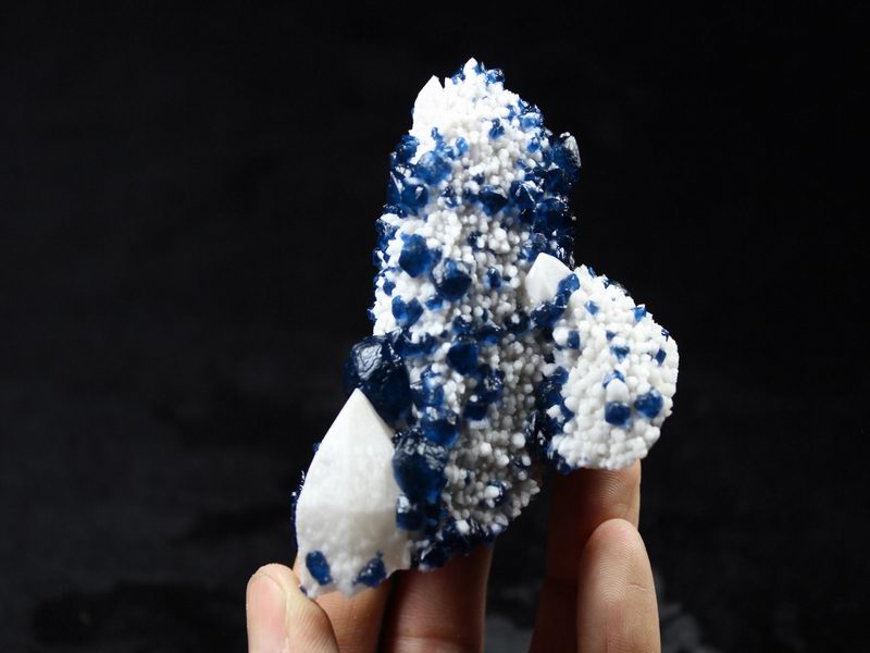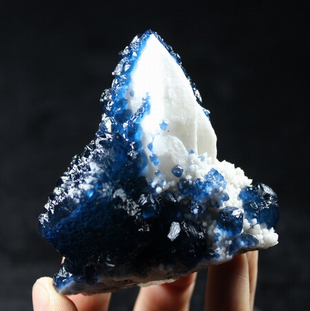 Vivid deep blue Fluorite crystals, with shades that vary between indigo and navy blue on a matrix of white crystallized Quartz. The smaller Fluorite crystals are neatly cubic, with small dodecahedron bevels and with very well defined curvatures on faces and edges, while the largest ones are unusually strongly rounded, a very uncommon shape for Fluorite. This shape is due to the balanced forms of the cube, polycrystalline and deeply edged, and the smooth dodecahedral faces, both dodecahedron and cube have curved faces and edges. Completely different from other, previous finds in Huanggang, it is a kind of dream for lovers of unusual crystallography.