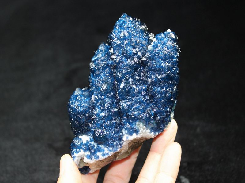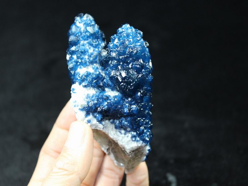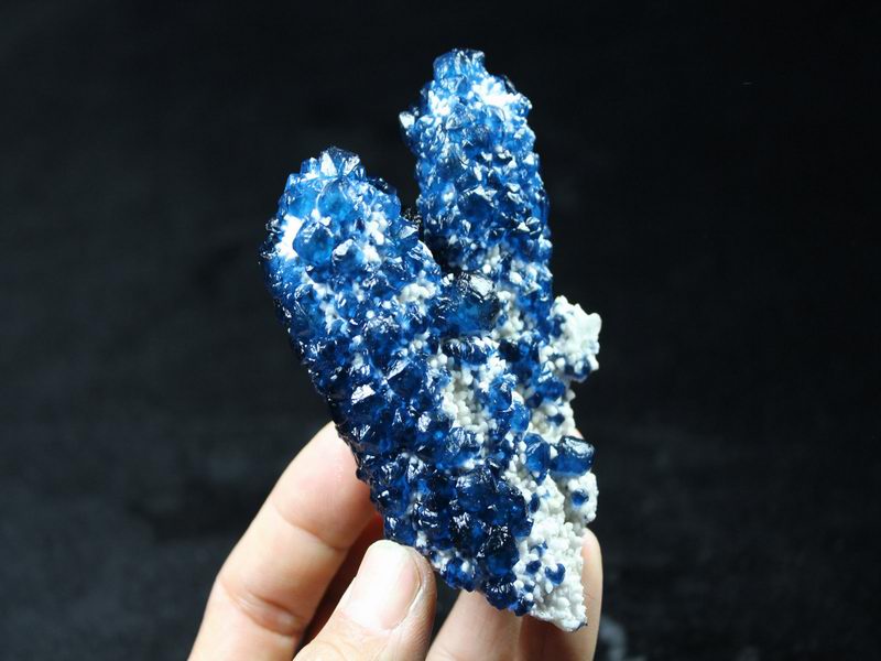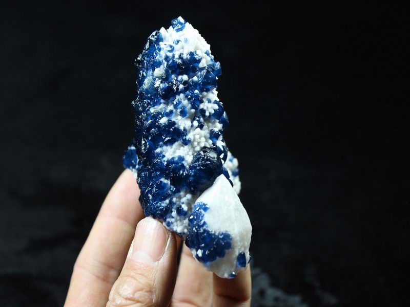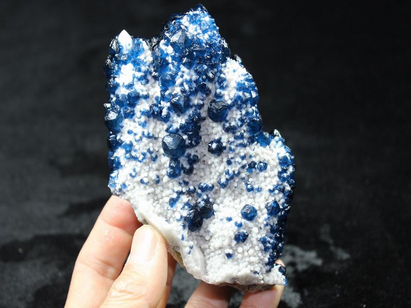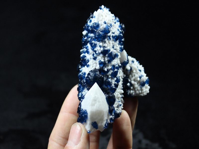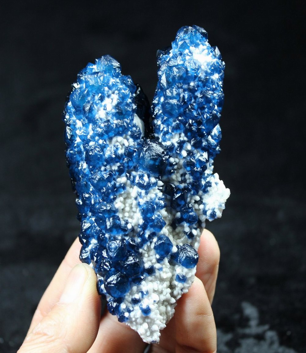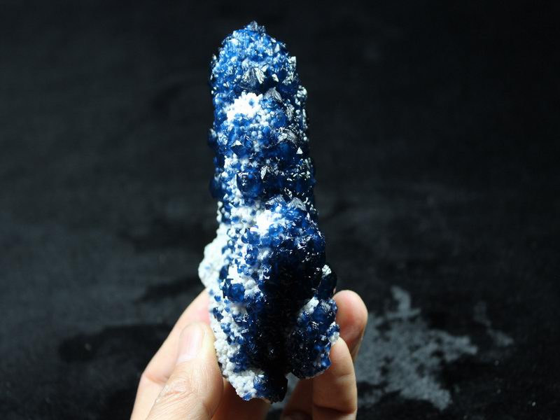 Vivid deep blue Fluorite crystals, with shades that vary between indigo and navy blue on a matrix of white crystallized Quartz. The smaller Fluorite crystals are neatly cubic, with small dodecahedron bevels and with very well defined curvatures on faces and edges, while the largest ones are unusually strongly rounded, a very uncommon shape for Fluorite. This shape is due to the balanced forms of the cube, polycrystalline and deeply edged, and the smooth dodecahedral faces, both dodecahedron and cube have curved faces and edges. Completely different from other, previous finds in Huanggang, it is a kind of dream for lovers of unusual crystallography.