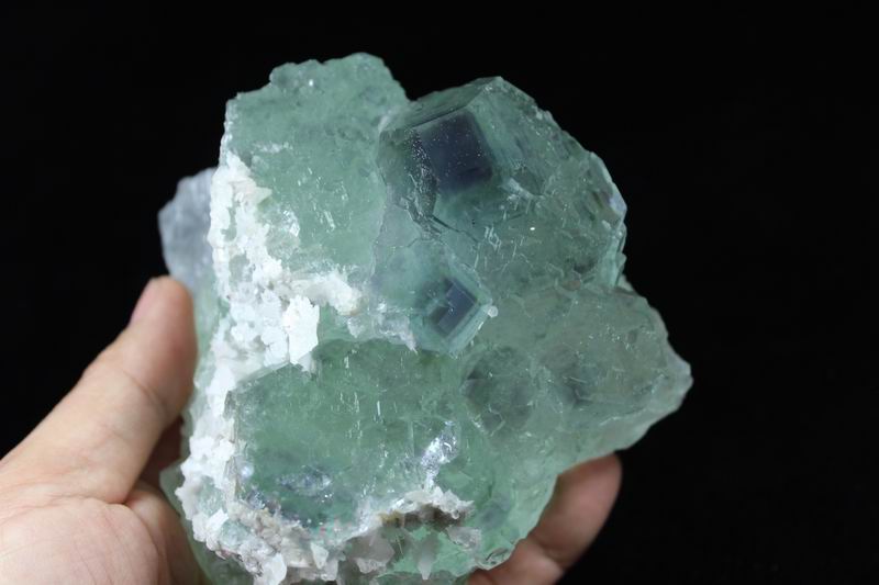 click on image to enlarge Calcite on Green Fluorite with Purple Phantom CM591882 USD168.00 Size: 15.5*12*8cm Weight: 1395g Chenzhou, Hunan