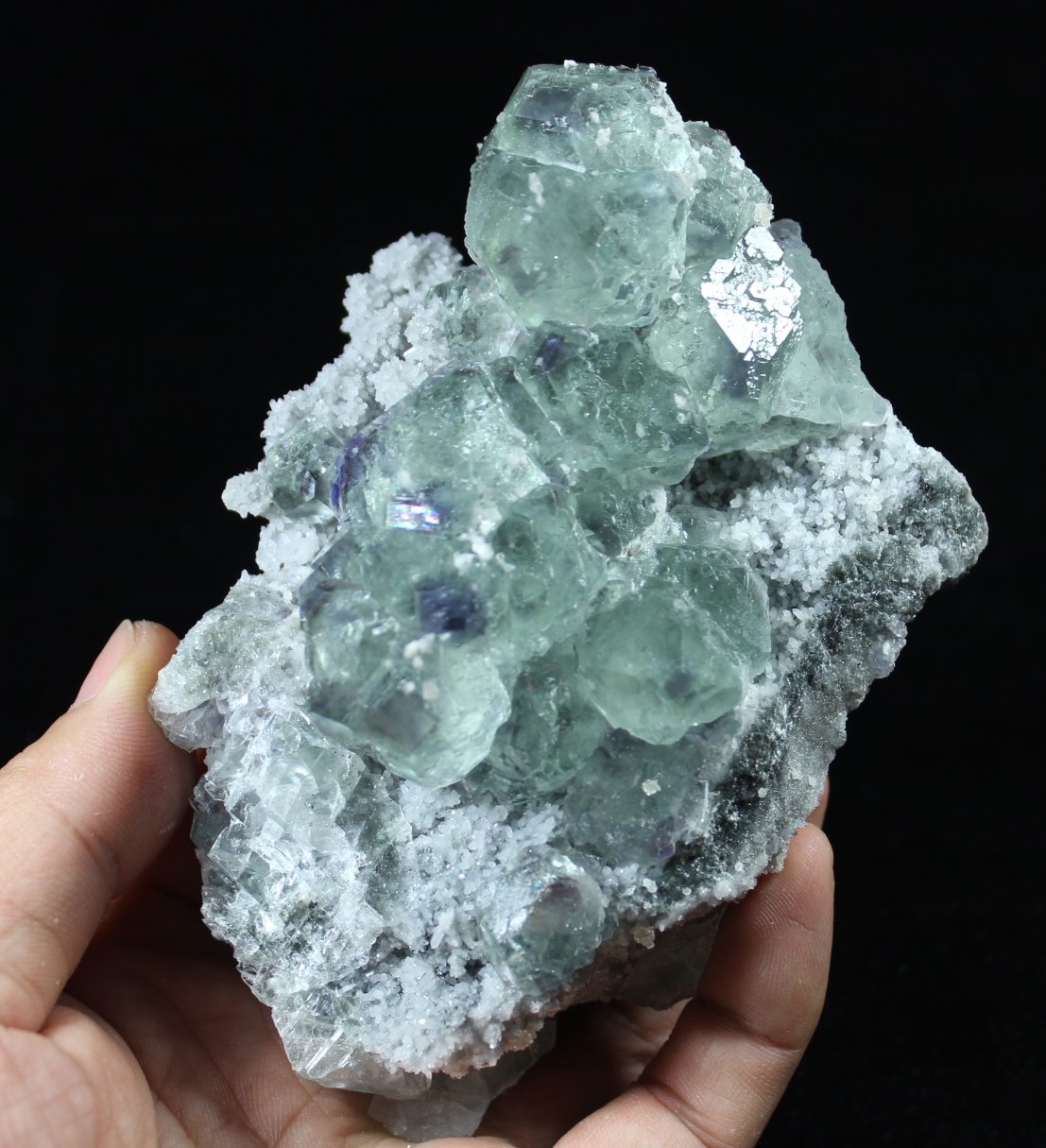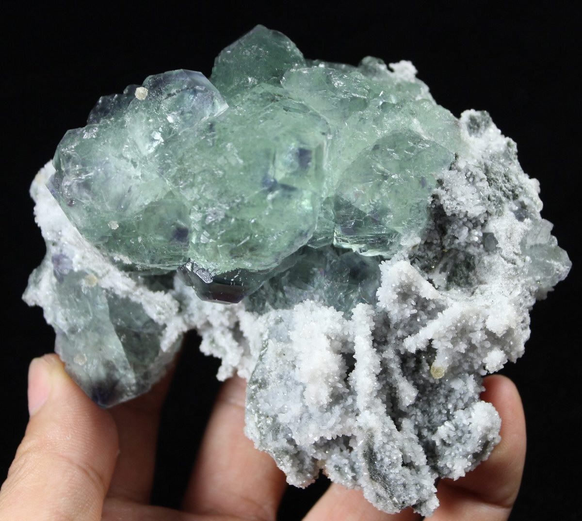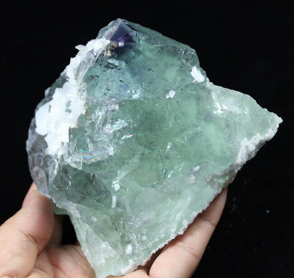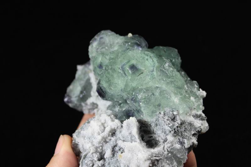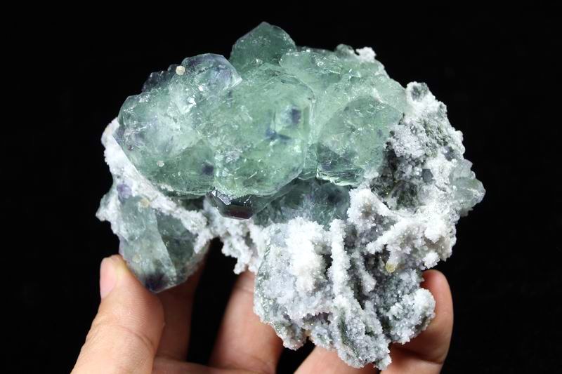 click on image to enlarge Calcite on Green Fluorite with Purple Phantom CM551888 USD168.00 Size: 9.5*8*8cm Weight: 530g Chenzhou, Hunan