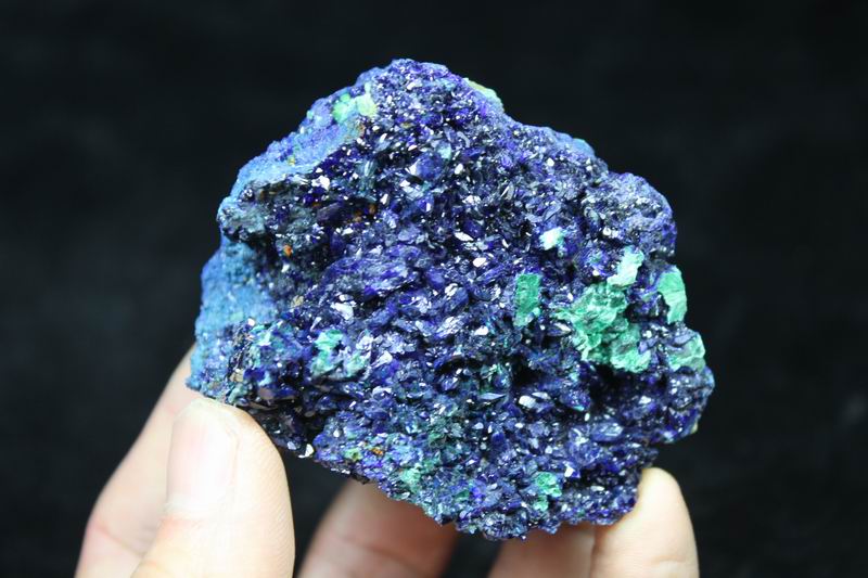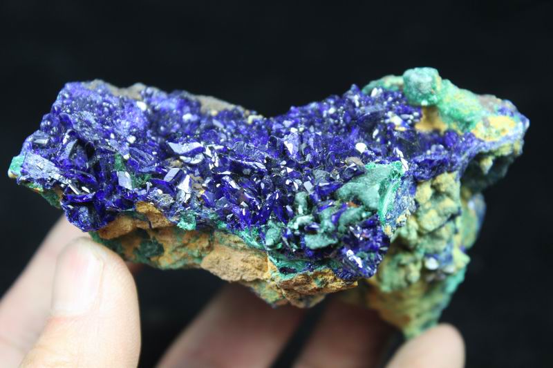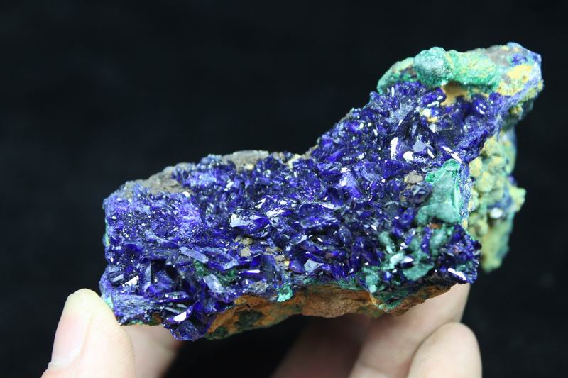 They're from Sepon Mine, Vilabouly Dist., Savannakhet Prov., Laos. It's a new locality. The Azurite crystals are highly lustrous, translucent, with rich "electric-blue" color under bright light. Very showy and attractive! Azurite & Malachite CM501036 USD118.00 Size: 10.5*6*5.5cm Weight: 340g Sepon Mine, Vilabouly Dist., Savannakhet Prov., Laos