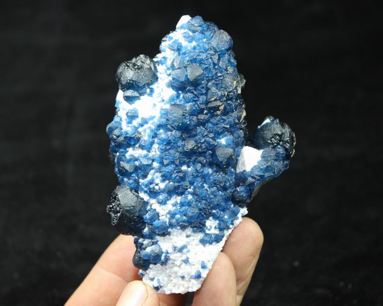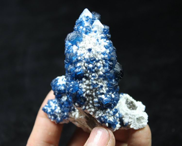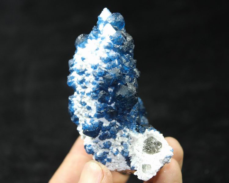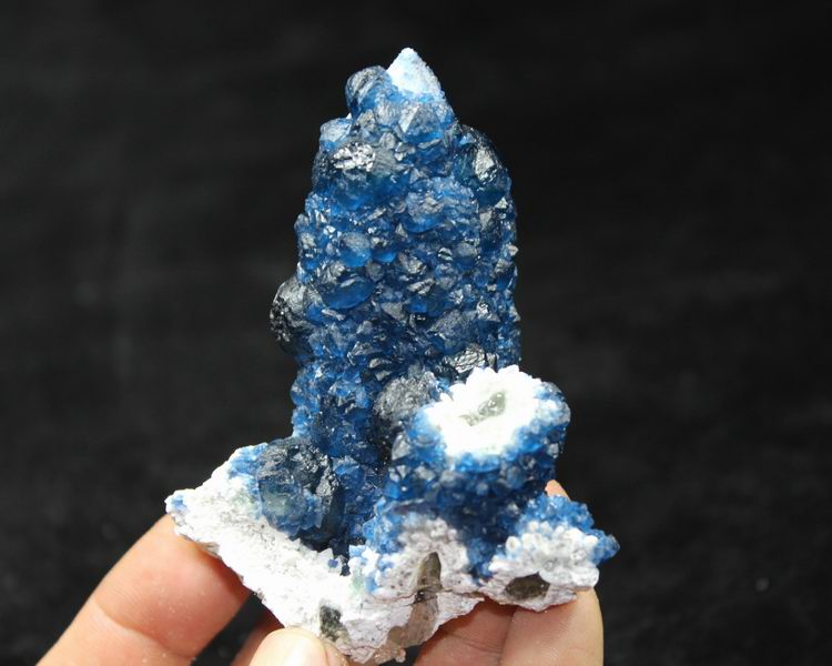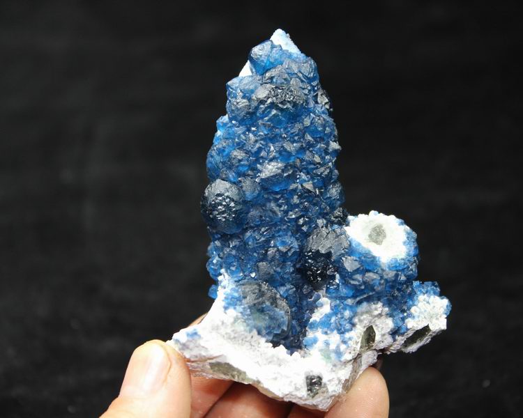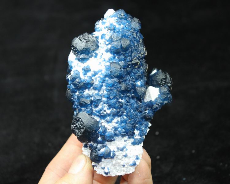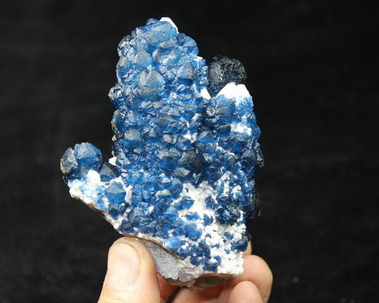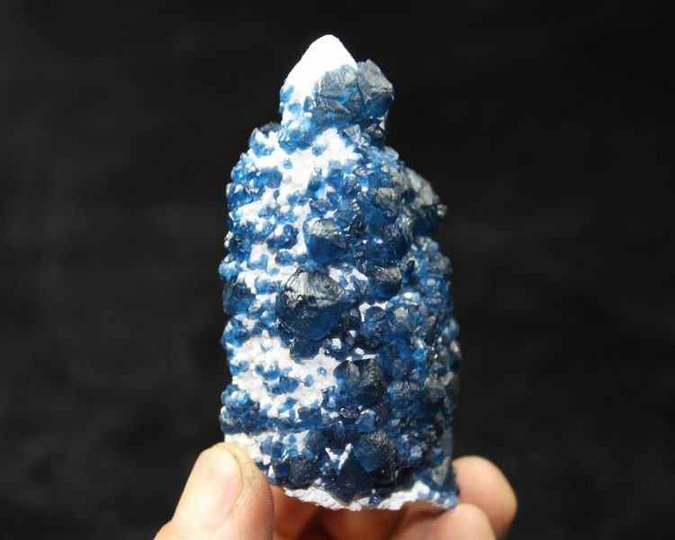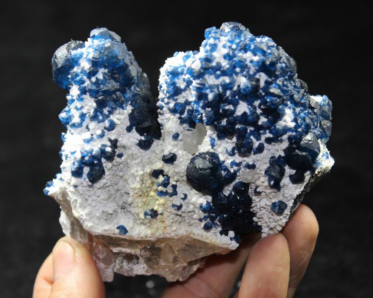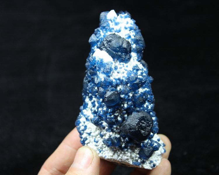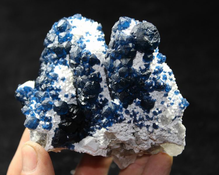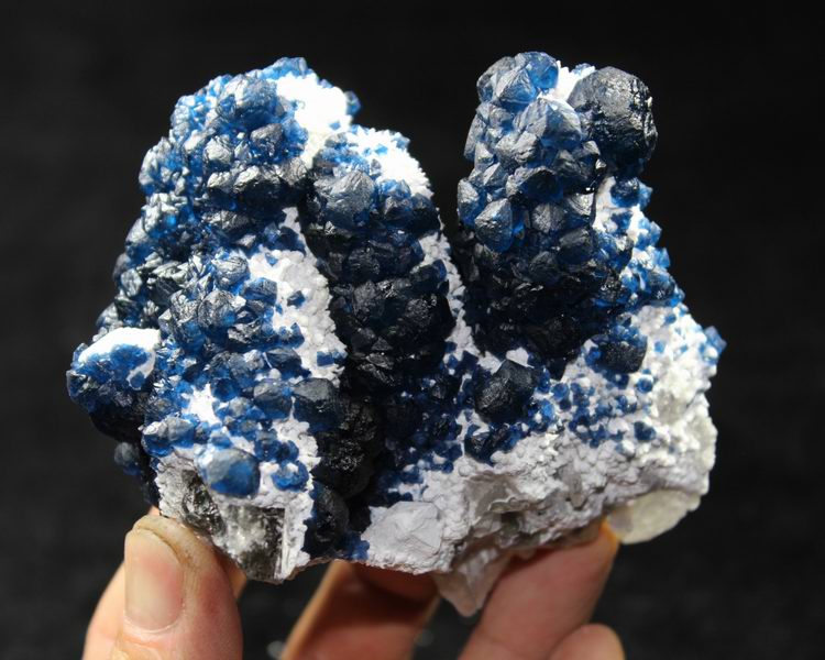 Vivid deep blue Fluorite crystals, with shades that vary between indigo and navy blue on a matrix of white crystallized Quartz. The smaller Fluorite crystals are neatly cubic, with small dodecahedron bevels and with very well defined curvatures on faces and edges, while the largest ones are unusually strongly rounded, a very uncommon shape for Fluorite. This shape is due to the balanced forms of the cube, polycrystalline and deeply edged, and the smooth dodecahedral faces, both dodecahedron and cube have curved faces and edges. Completely different from other, previous finds in Huanggang, it is a kind of dream for lovers of unusual crystallography.