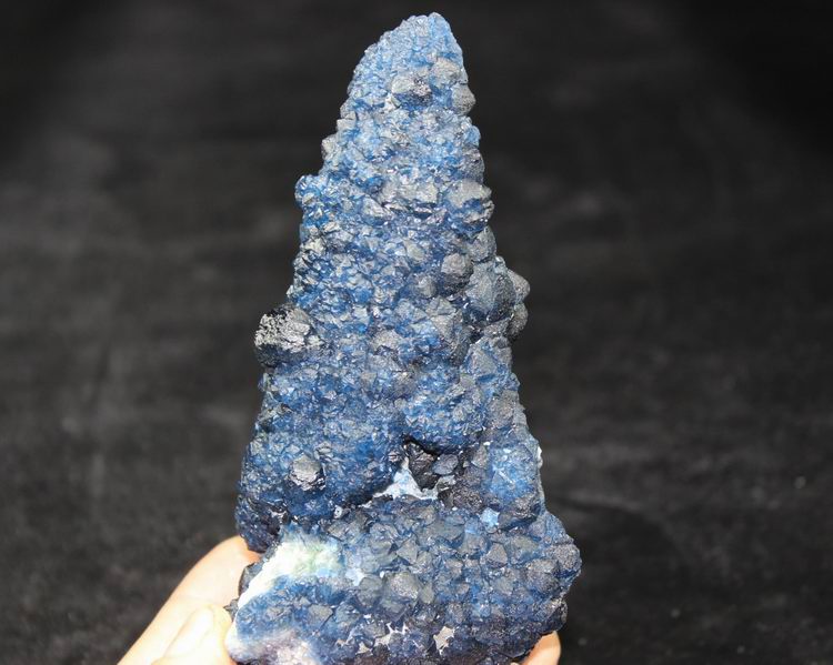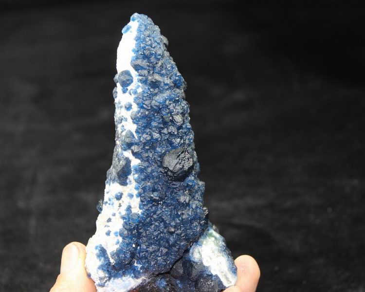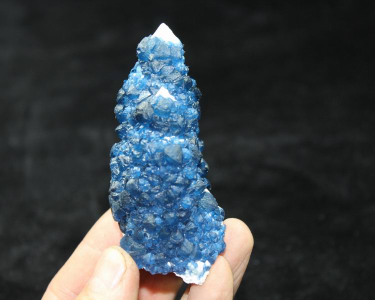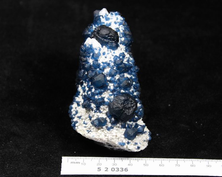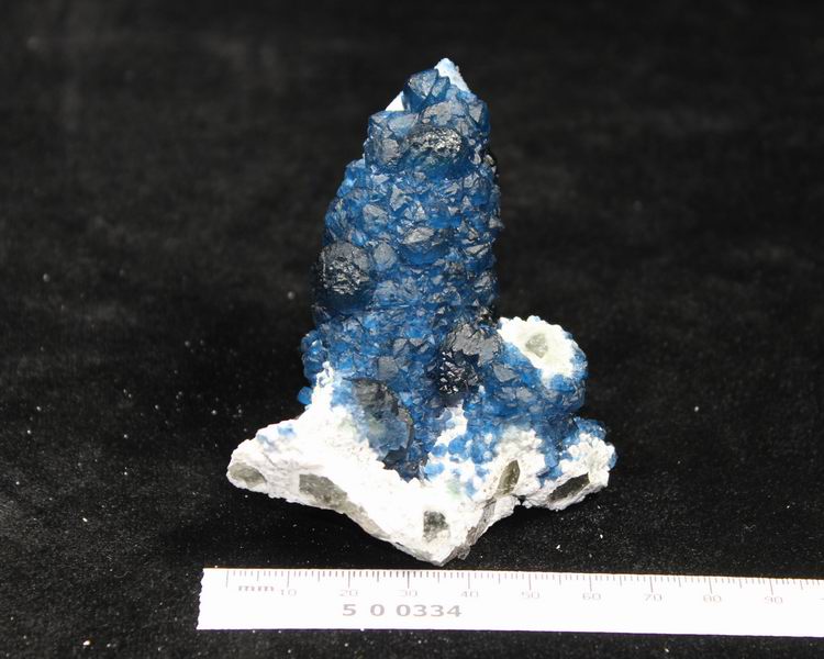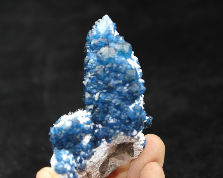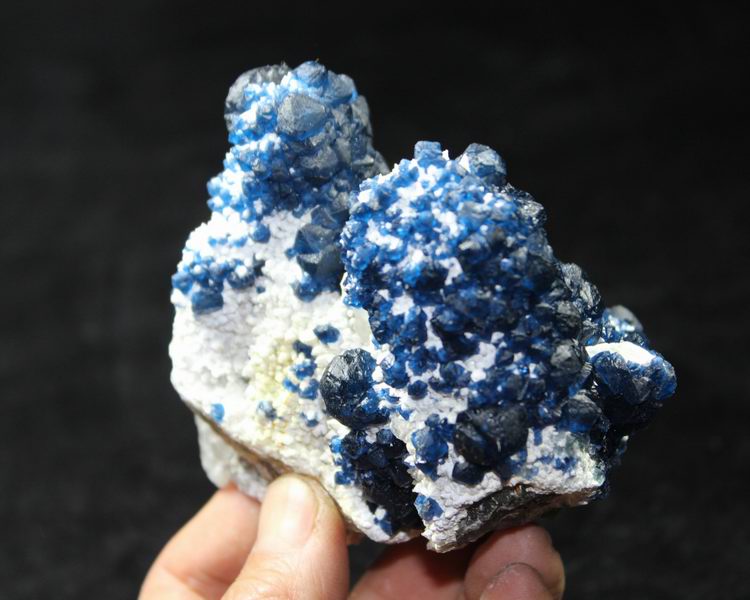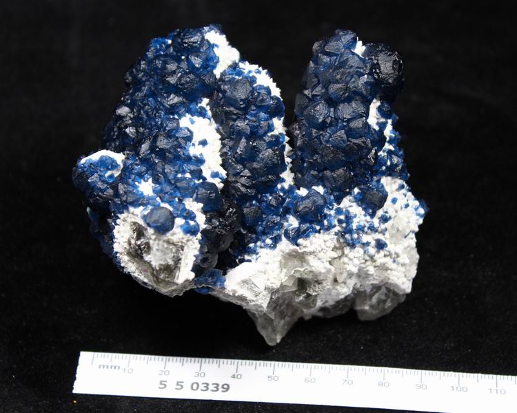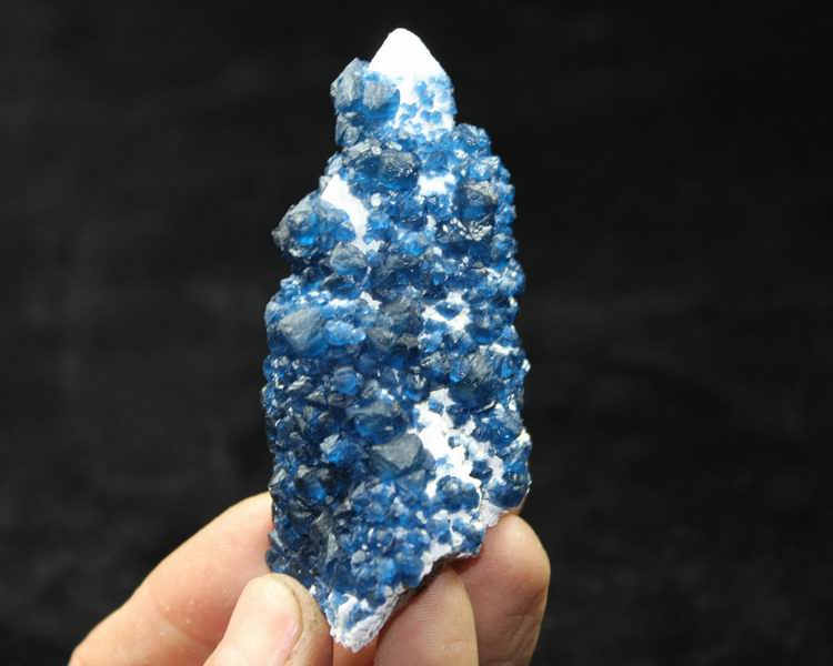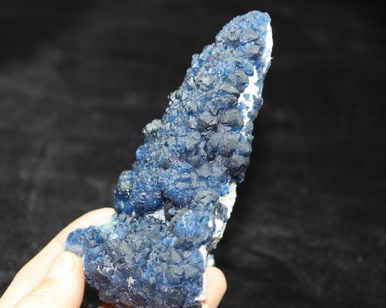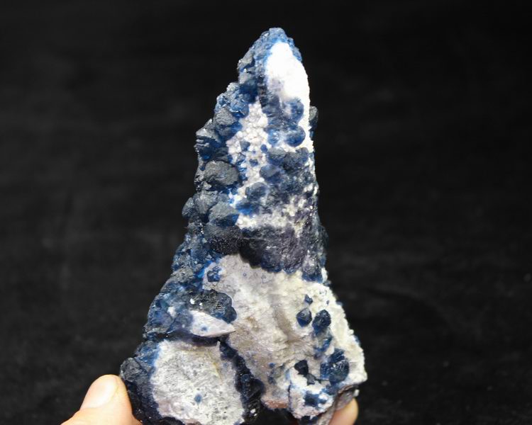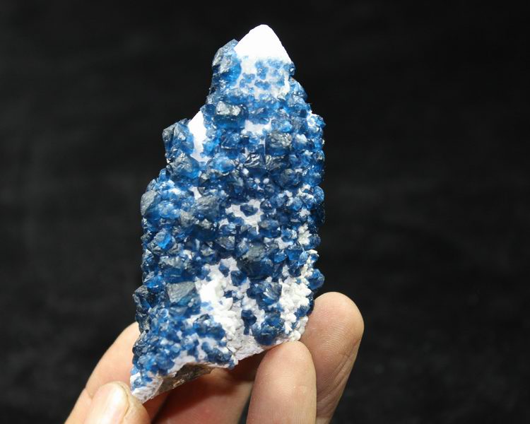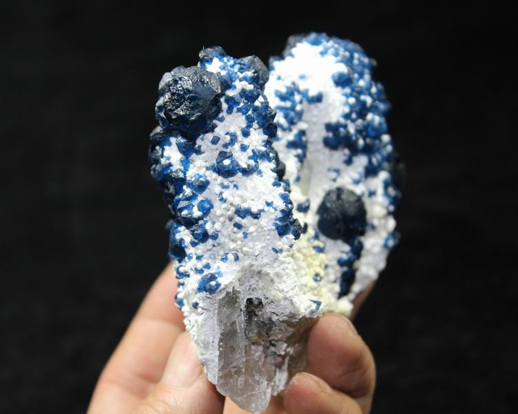 Vivid deep blue Fluorite crystals, with shades that vary between indigo and navy blue on a matrix of white crystallized Quartz. The smaller Fluorite crystals are neatly cubic, with small dodecahedron bevels and with very well defined curvatures on faces and edges, while the largest ones are unusually strongly rounded, a very uncommon shape for Fluorite. This shape is due to the balanced forms of the cube, polycrystalline and deeply edged, and the smooth dodecahedral faces, both dodecahedron and cube have curved faces and edges. Completely different from other, previous finds in Huanggang, it is a kind of dream for lovers of unusual crystallography.