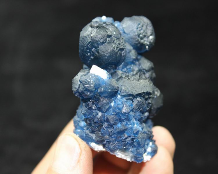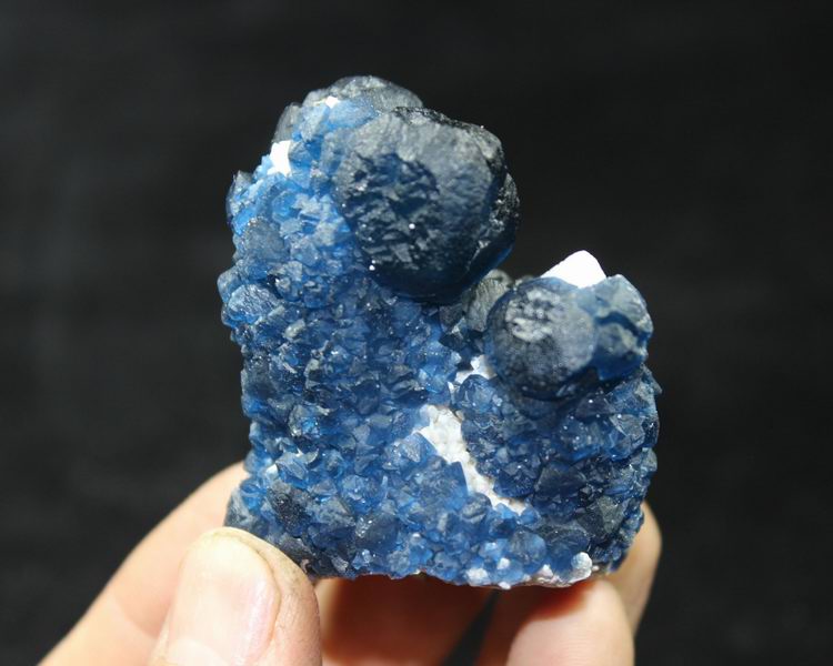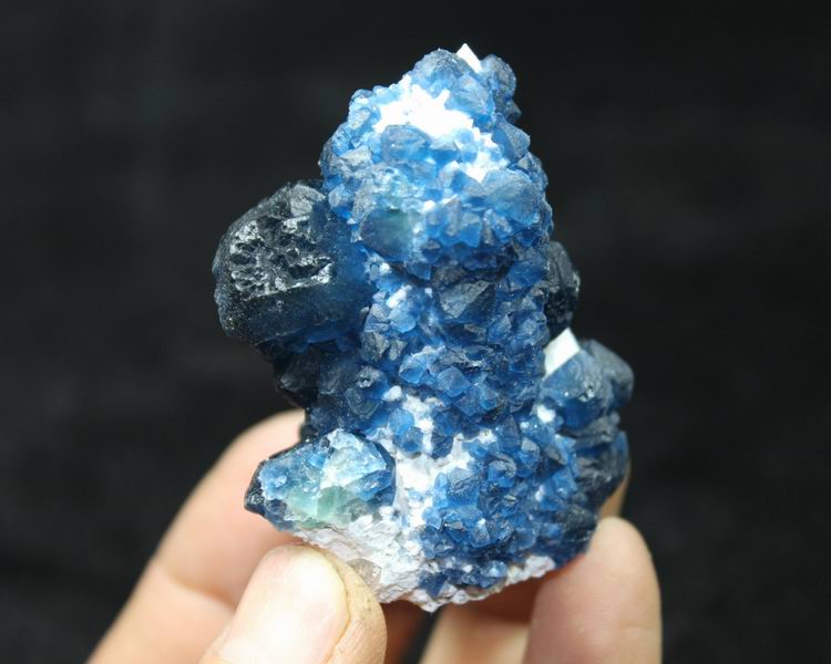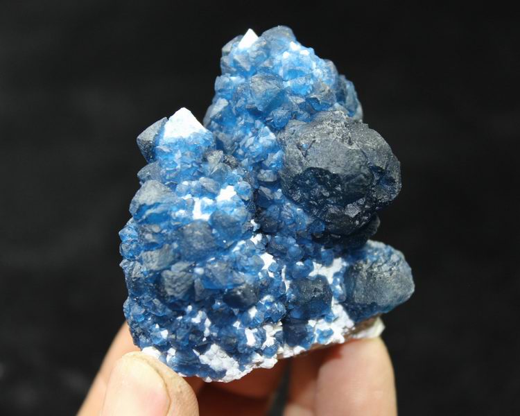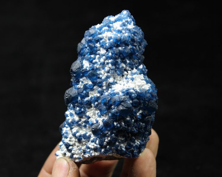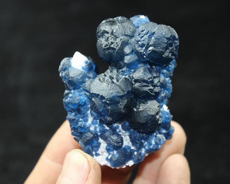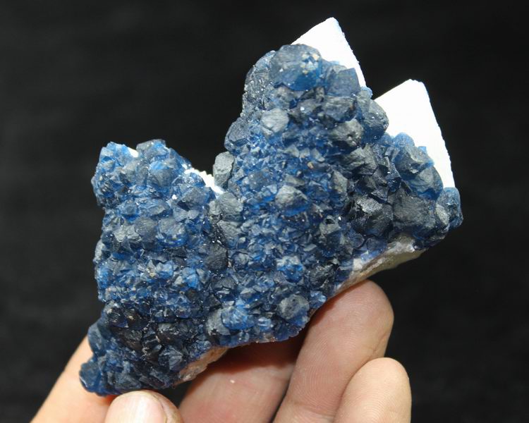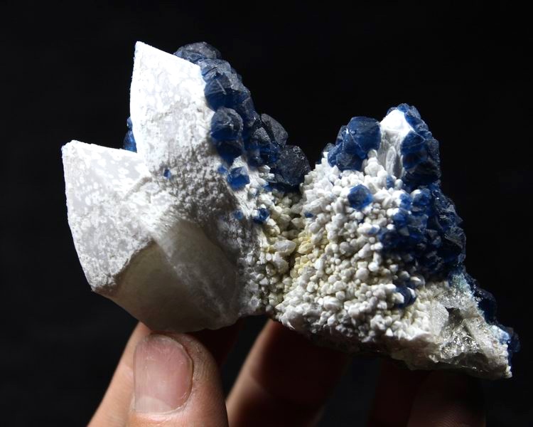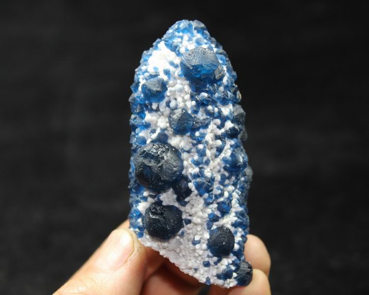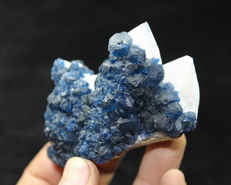 Vivid deep blue Fluorite crystals, with shades that vary between indigo and navy blue on a matrix of white crystallized Quartz. The smaller Fluorite crystals are neatly cubic, with small dodecahedron bevels and with very well defined curvatures on faces and edges, while the largest ones are unusually strongly rounded, a very uncommon shape for Fluorite. This shape is due to the balanced forms of the cube, polycrystalline and deeply edged, and the smooth dodecahedral faces, both dodecahedron and cube have curved faces and edges. Completely different from other, previous finds in Huanggang, it is a kind of dream for lovers of unusual crystallography.