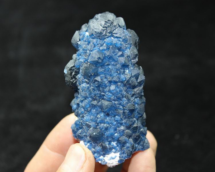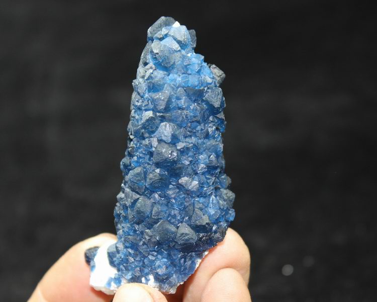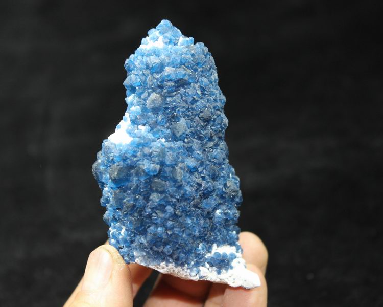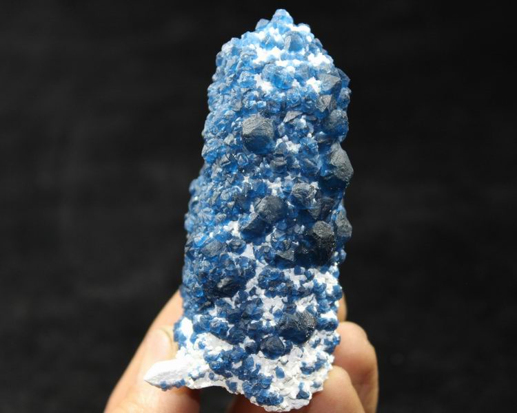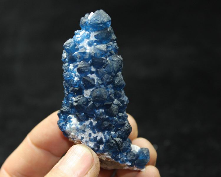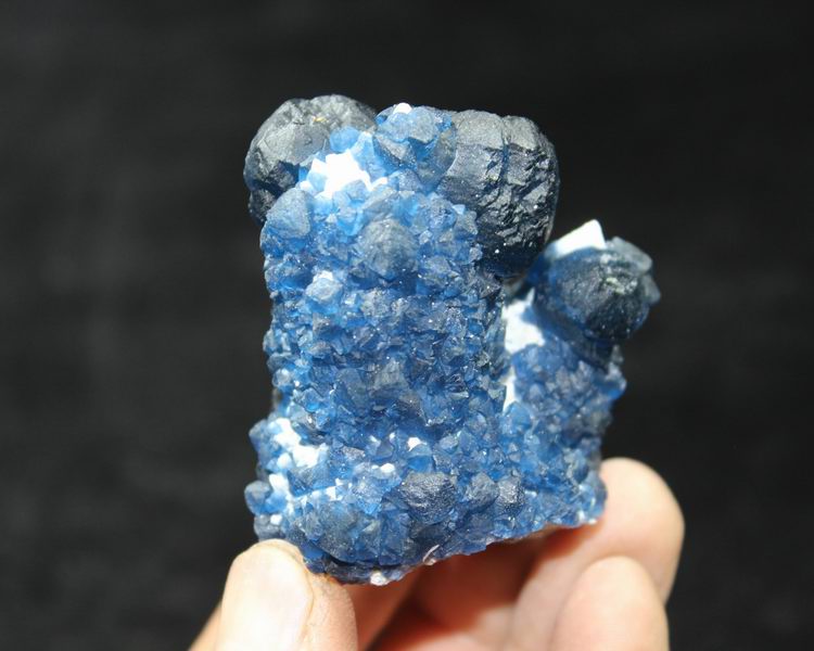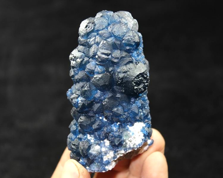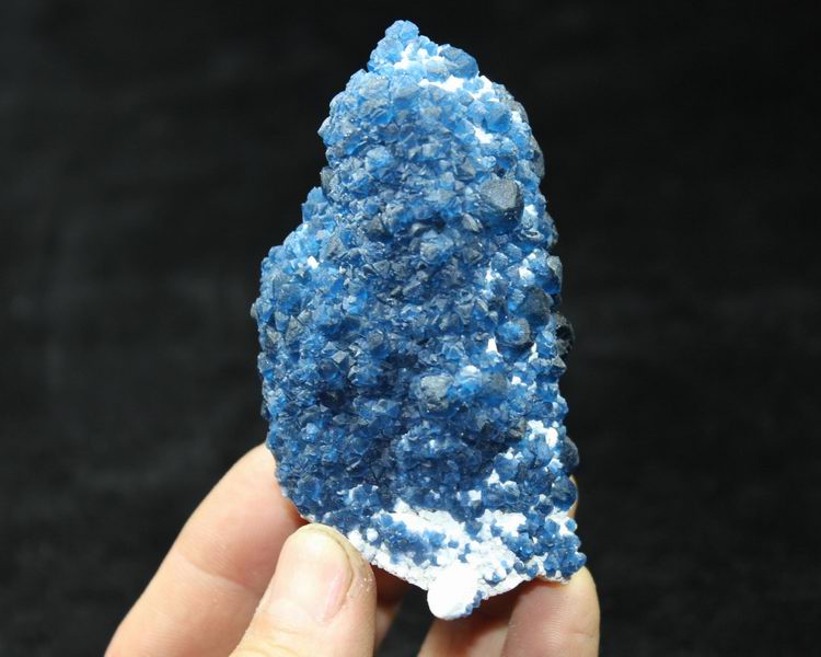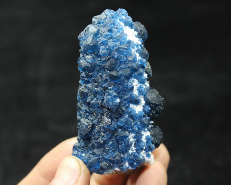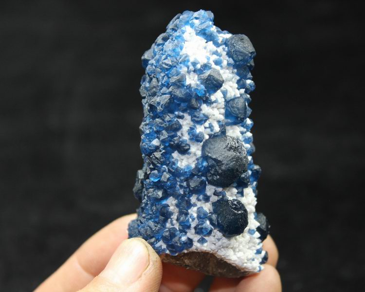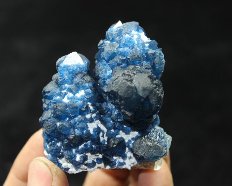 Vivid deep blue Fluorite crystals, with shades that vary between indigo and navy blue on a matrix of white crystallized Quartz. The smaller Fluorite crystals are neatly cubic, with small dodecahedron bevels and with very well defined curvatures on faces and edges, while the largest ones are unusually strongly rounded, a very uncommon shape for Fluorite. This shape is due to the balanced forms of the cube, polycrystalline and deeply edged, and the smooth dodecahedral faces, both dodecahedron and cube have curved faces and edges. Completely different from other, previous finds in Huanggang, it is a kind of dream for lovers of unusual crystallography.