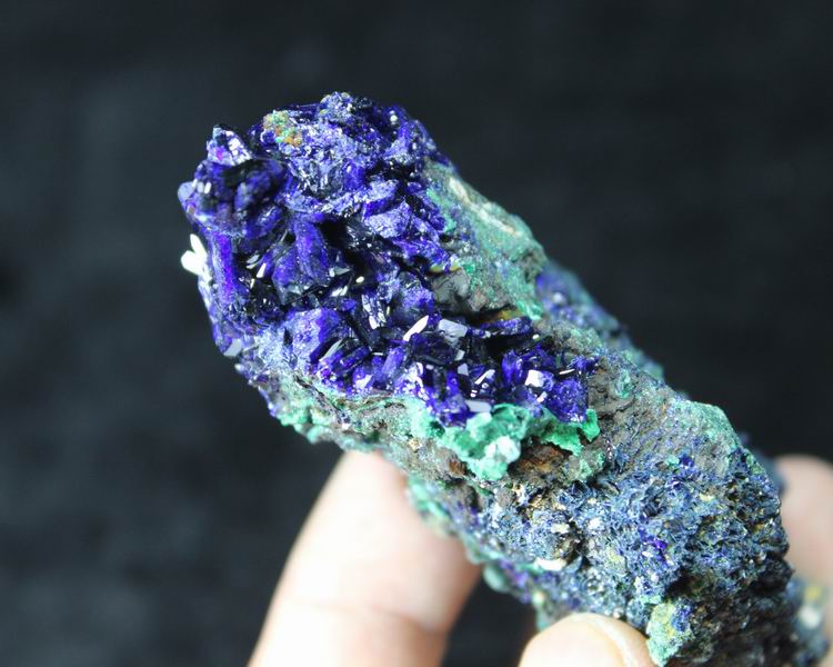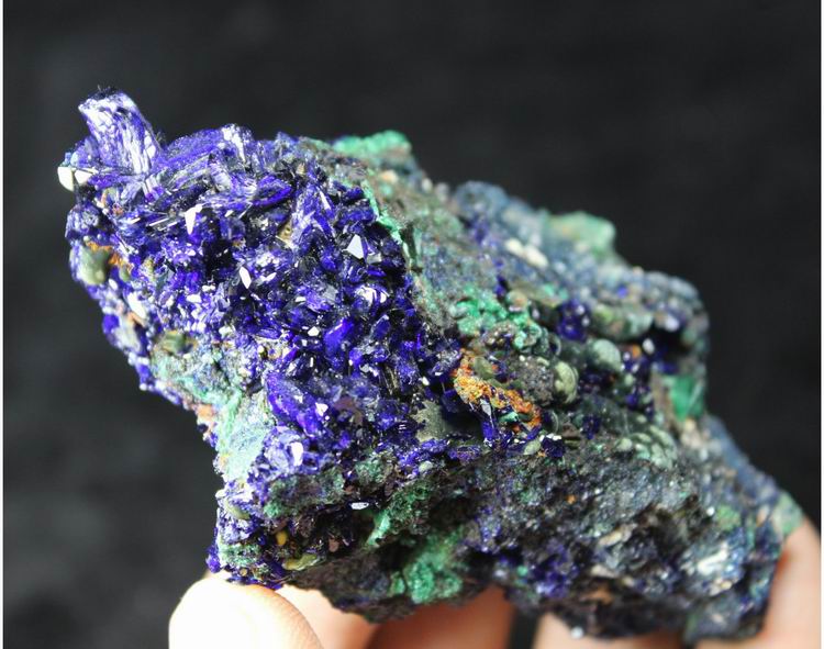 They're from Sepon Mine, Vilabouly Dist., Savannakhet Prov., Laos. It's a new locality. The Azurite crystals are highly lustrous, translucent, with rich "electric-blue" color under bright light. Very showy and attractive! Azurite & Malachite CM511361 USD49.00 Size: 7.4*4*4cm Weight: 165g Sepon Mine, Vilabouly Dist., Savannakhet Prov., Laos