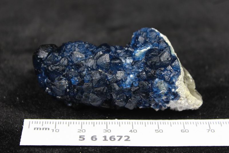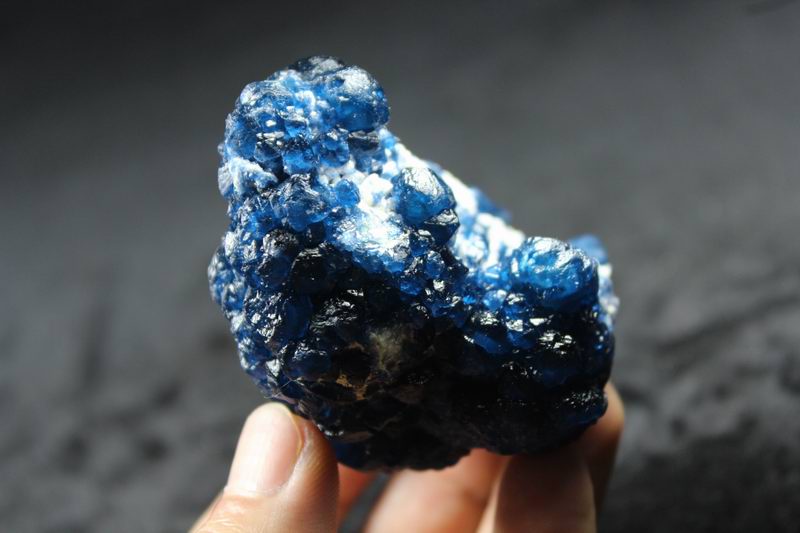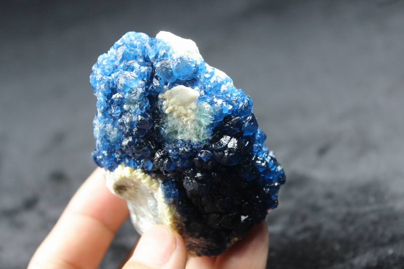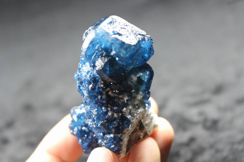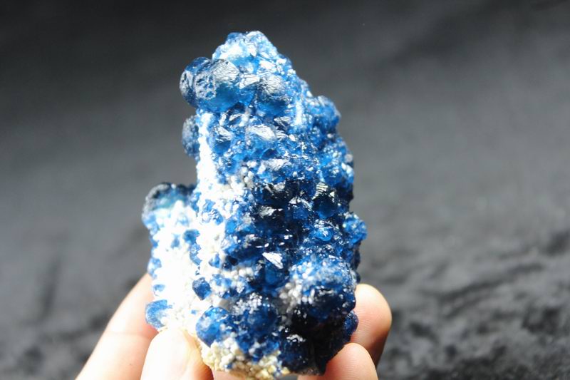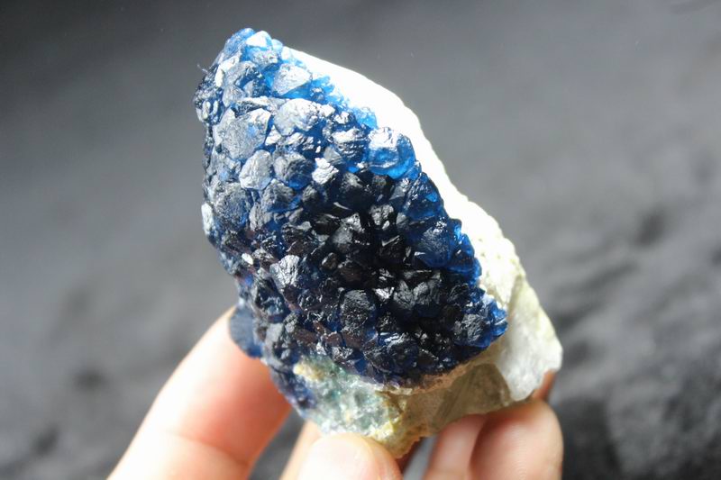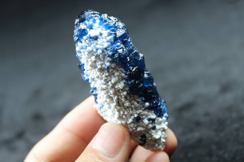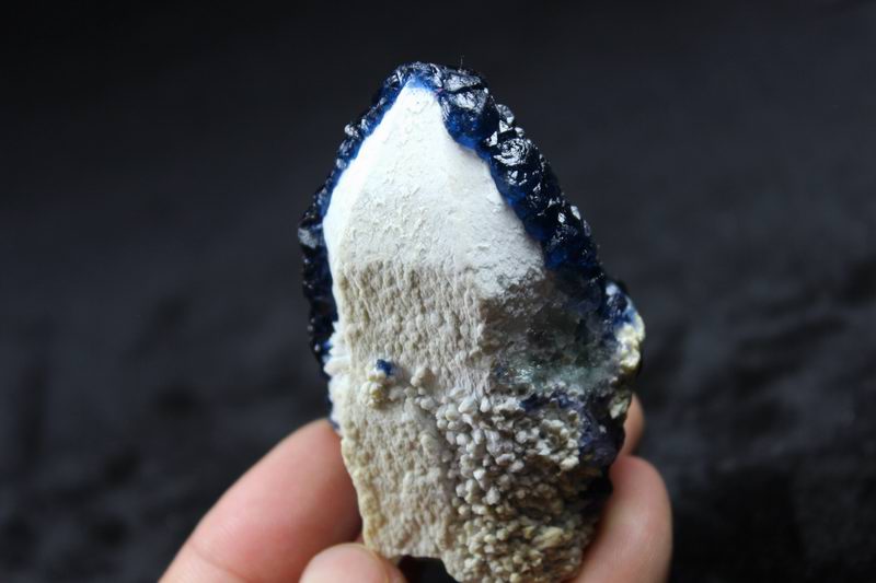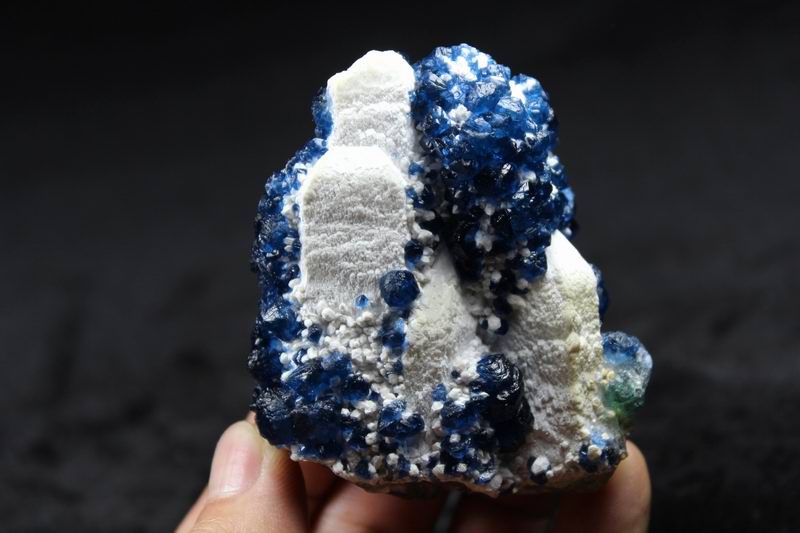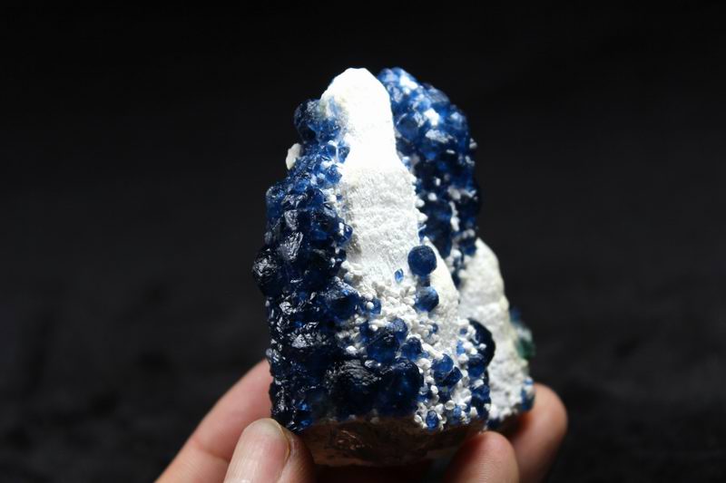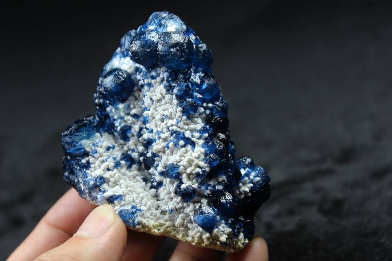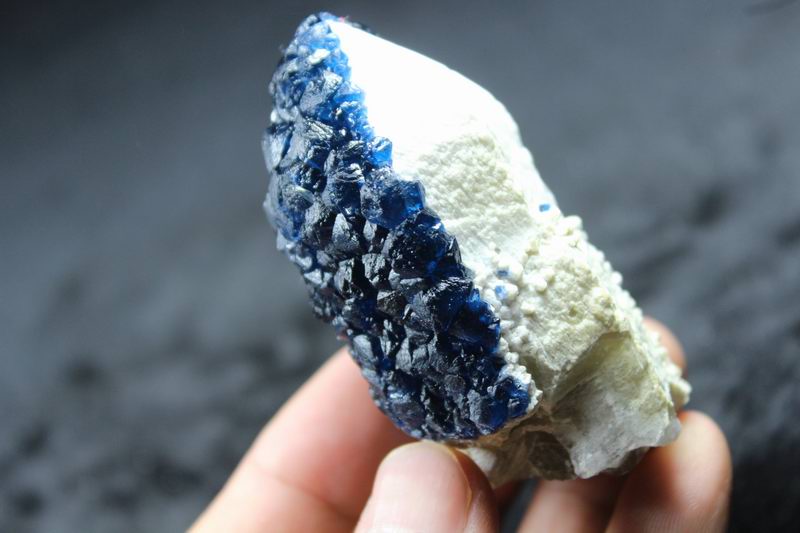 Vivid deep blue Fluorite crystals, with shades that vary between indigo and navy blue on a matrix of white crystallized Quartz. The smaller Fluorite crystals are neatly cubic, with small dodecahedron bevels and with very well defined curvatures on faces and edges, while the largest ones are unusually strongly rounded, a very uncommon shape for Fluorite. This shape is due to the balanced forms of the cube, polycrystalline and deeply edged, and the smooth dodecahedral faces, both dodecahedron and cube have curved faces and edges. Completely different from other, previous finds in Huanggang, it is a kind of dream for lovers of unusual crystallography.