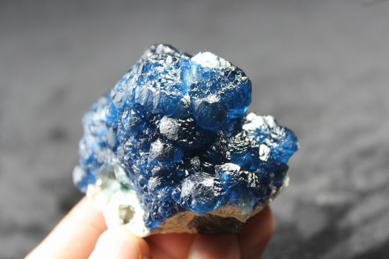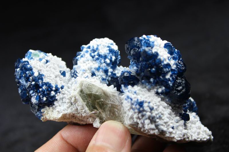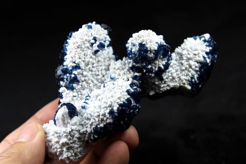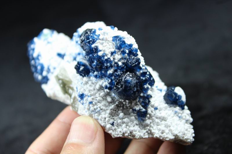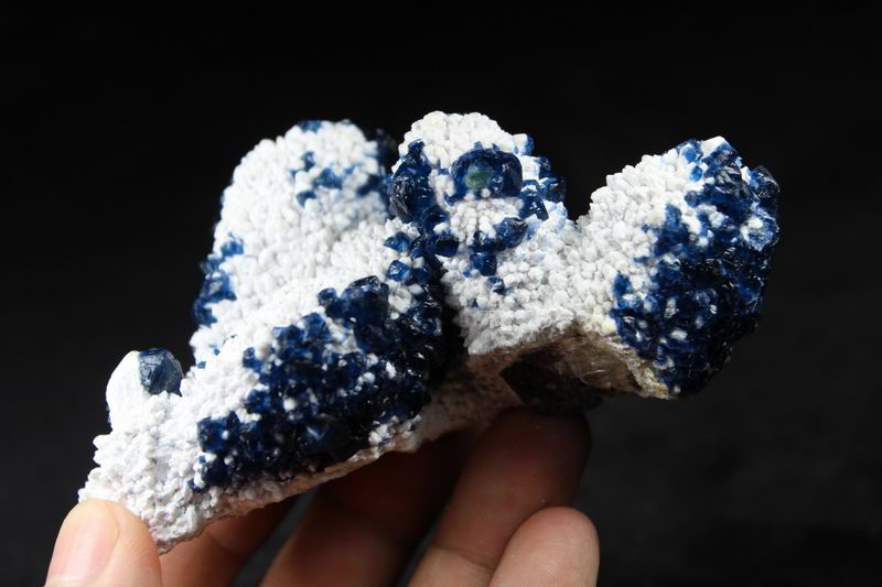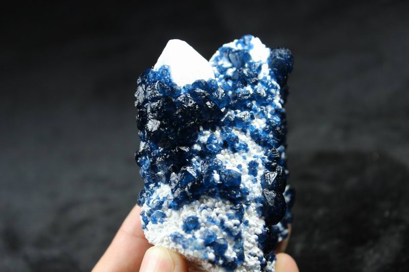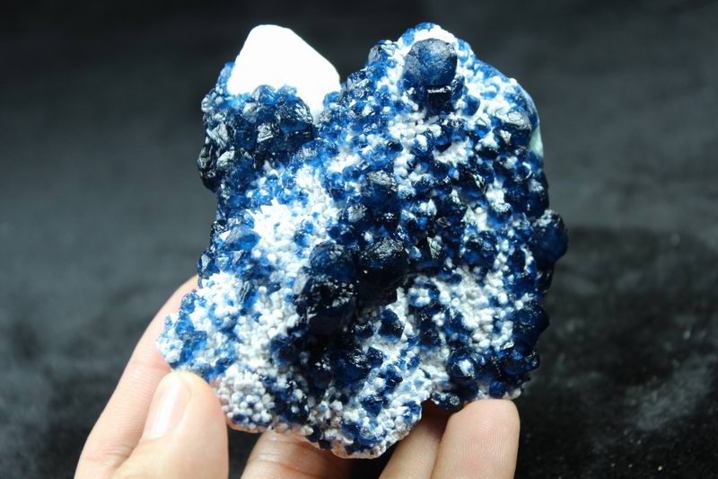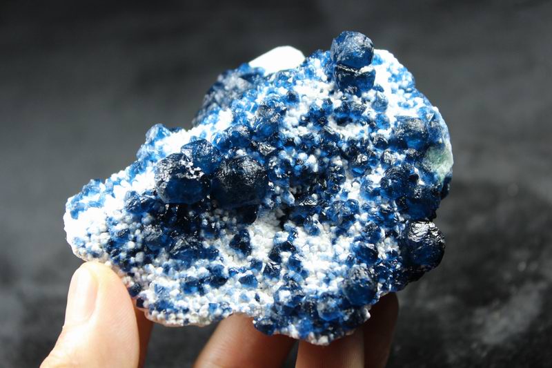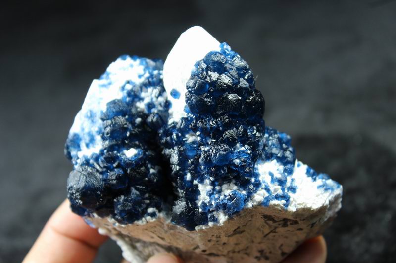 Vivid deep blue Fluorite crystals, with shades that vary between indigo and navy blue on a matrix of white crystallized Quartz. The smaller Fluorite crystals are neatly cubic, with small dodecahedron bevels and with very well defined curvatures on faces and edges, while the largest ones are unusually strongly rounded, a very uncommon shape for Fluorite. This shape is due to the balanced forms of the cube, polycrystalline and deeply edged, and the smooth dodecahedral faces, both dodecahedron and cube have curved faces and edges. Completely different from other, previous finds in Huanggang, it is a kind of dream for lovers of unusual crystallography.